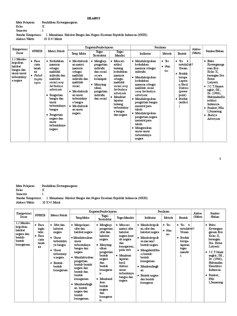 Silabus Pkn Kelas X : Silabus Pkn X Semester 1 - Setelah sebelumnya saya membagikan perangkat pembelajaran silabus untuk mata pelajaran ppkn kelas x maka pada artikel kali ini saya akan kem.. Berikut kami sajikan silabus kelas 1, 2, 3, 4, 5, 6 ktsp sd, untuk preview klik tanda panah di bagian kanan atas bidang kotak dibawah ini, untuk download silahkan klik link dibawah ini. Silabus pkn sma kelas x, xi, xii semester 1 dan 2 (download). Dapat dipercaya ( trustworthines) ketulusan ( honesty ) integritas ( integrity. Memahami hakikat bangsa dan negara kesatuan republik indonesia (nkri). Menerapkan hidup rukun dalam perbedaan.